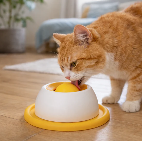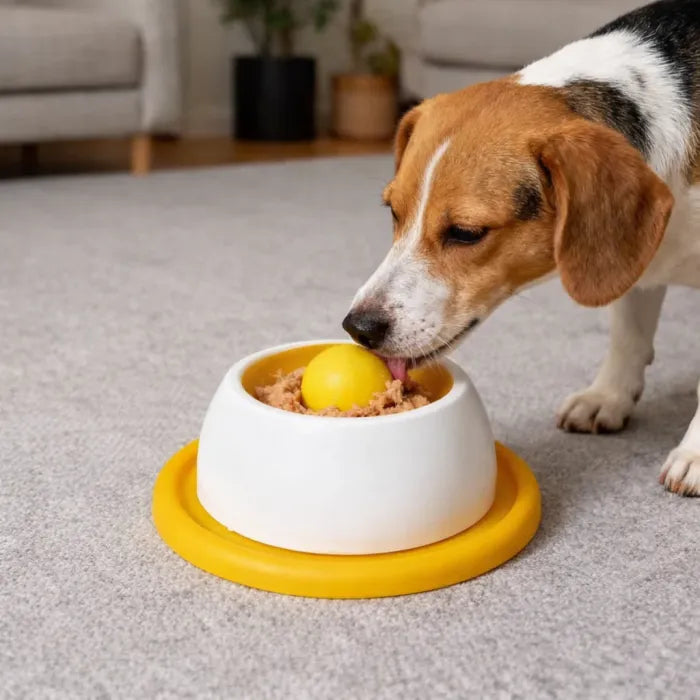 Das rotierende Kugel-Design verhindert hastiges Schlingen, reduziert Stress und sorgt dafür, dass Futter dort bleibt, wo es hingehört – im Napf, nicht auf dem Boden.